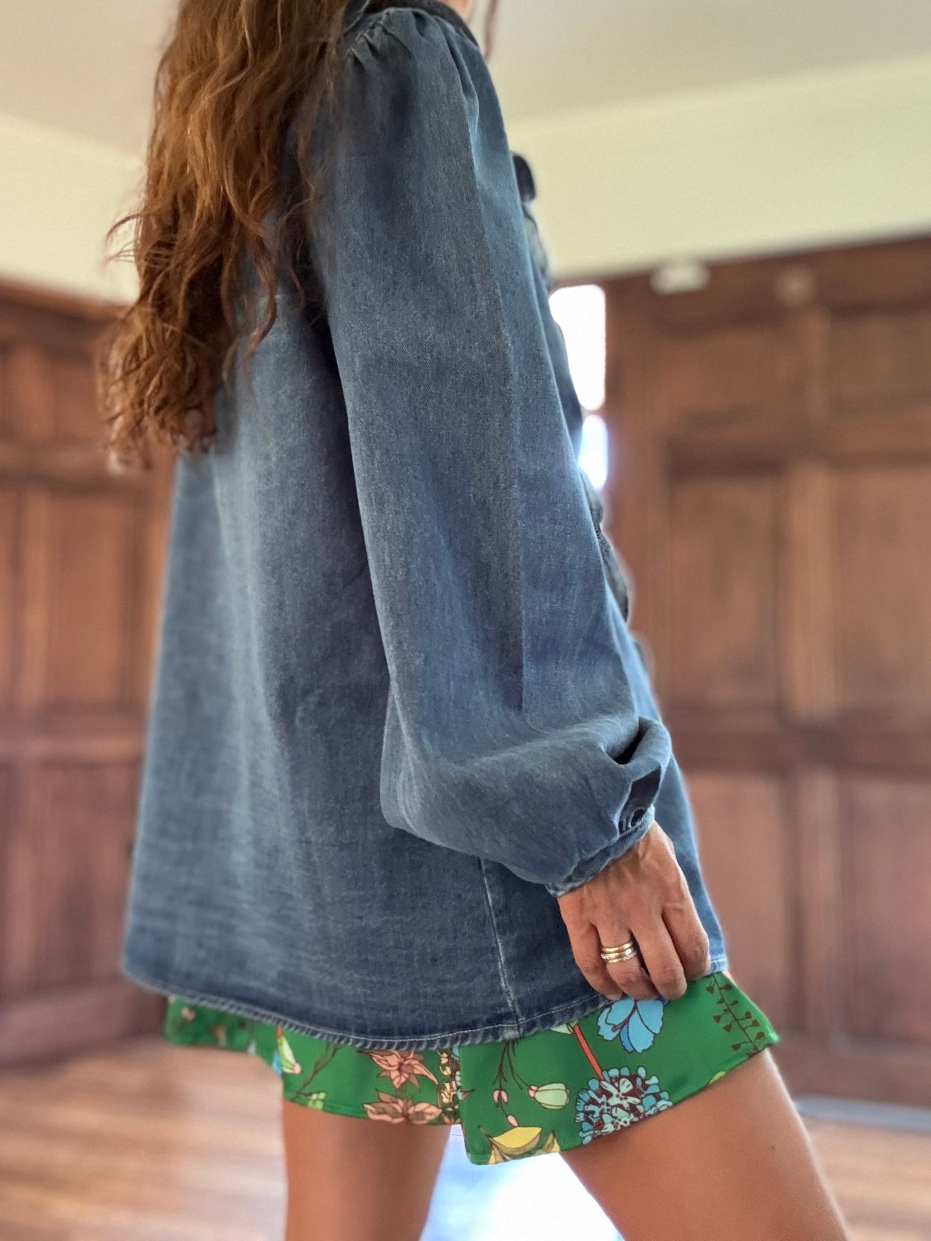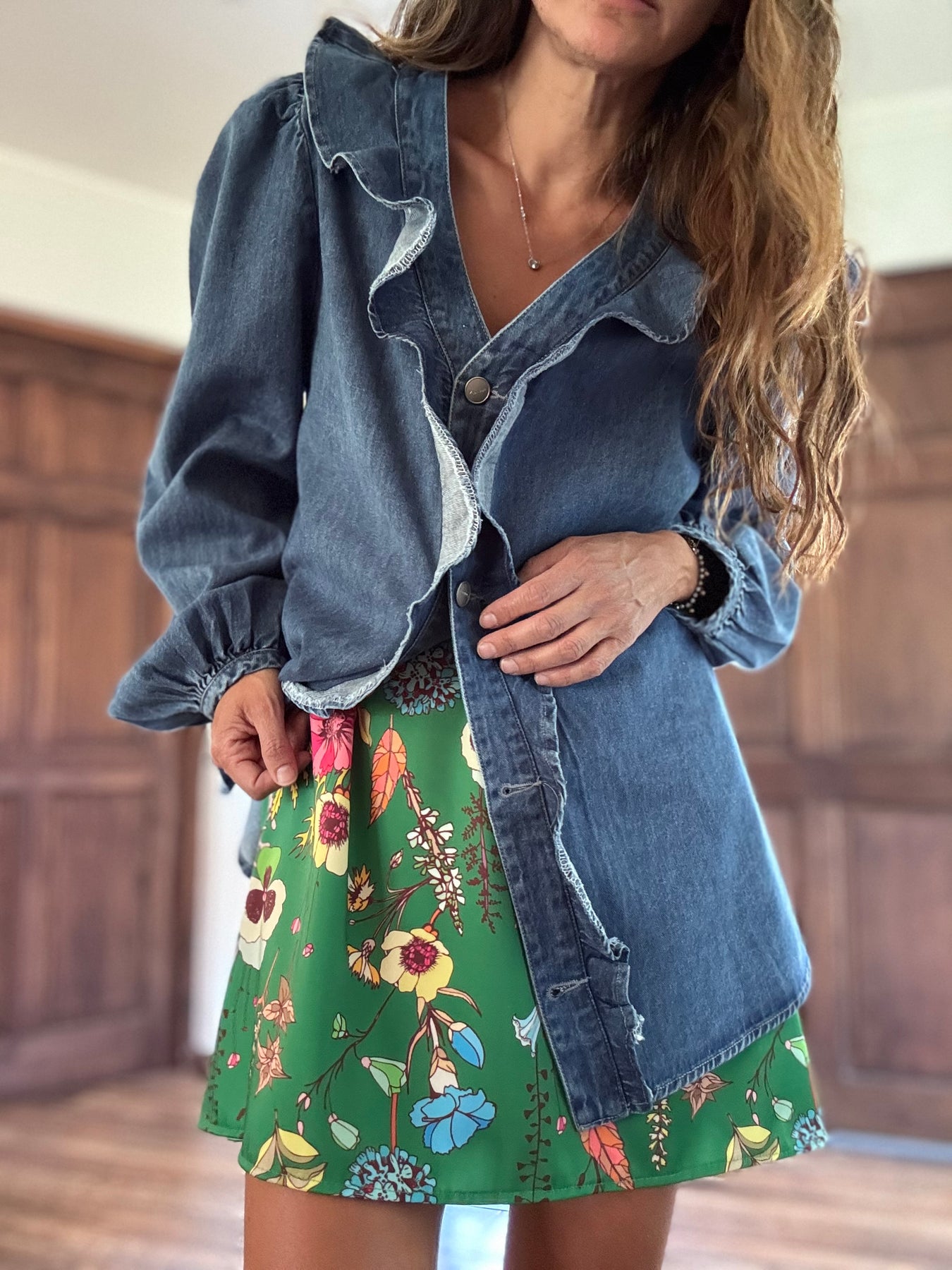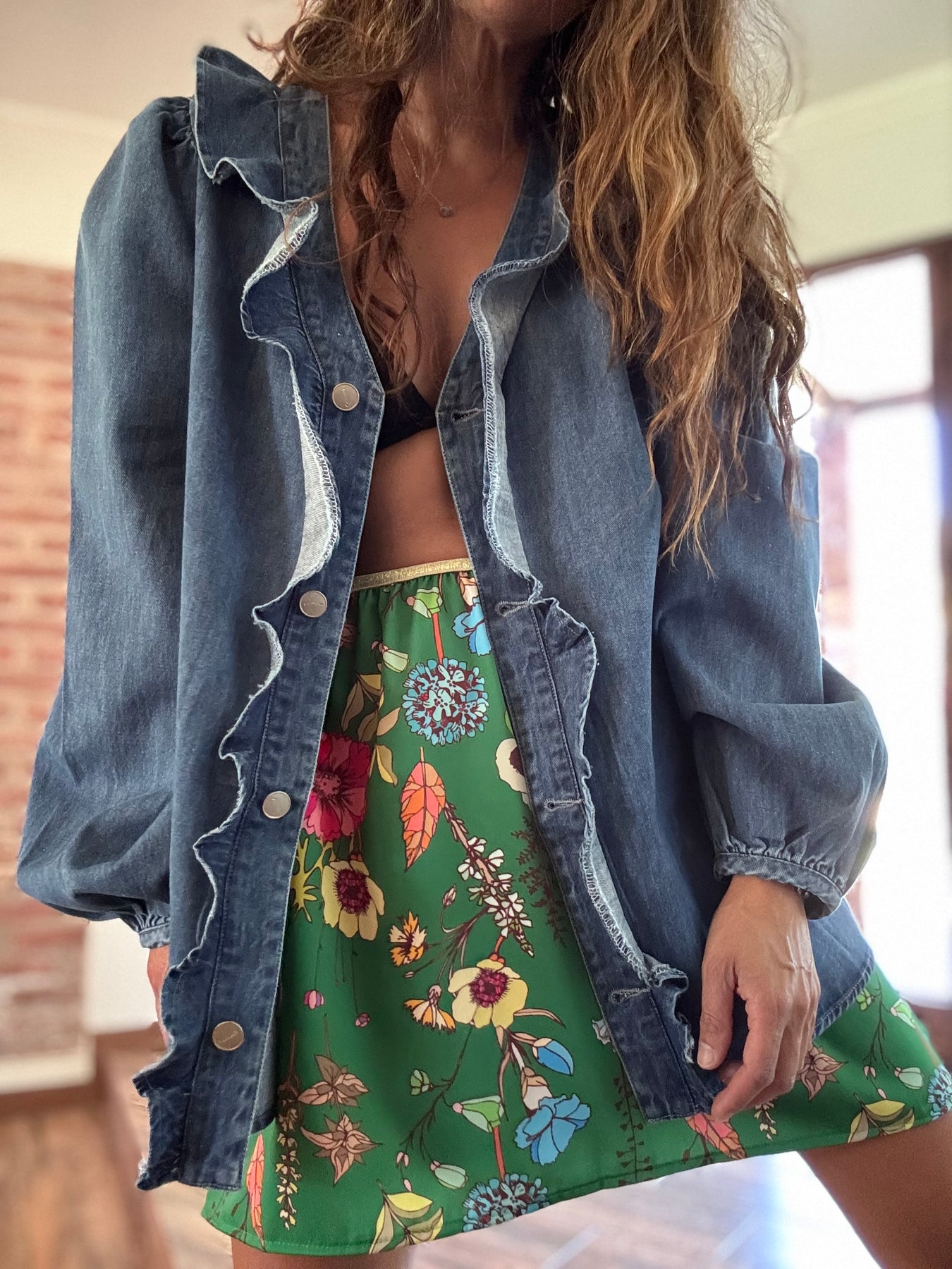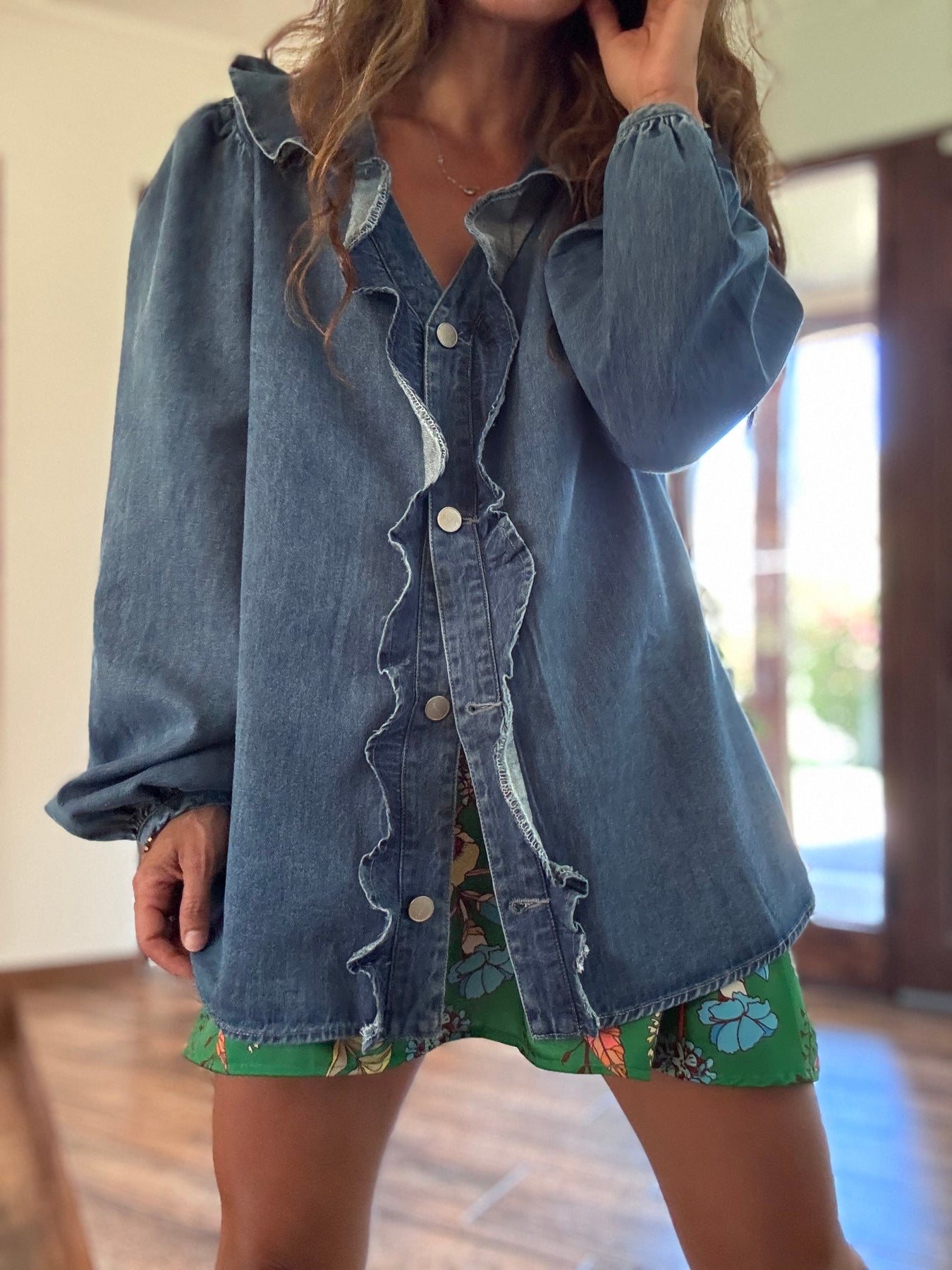 Sobre camisa jeans no elasticado, botones metálicos / Disponible en tallas S M y L