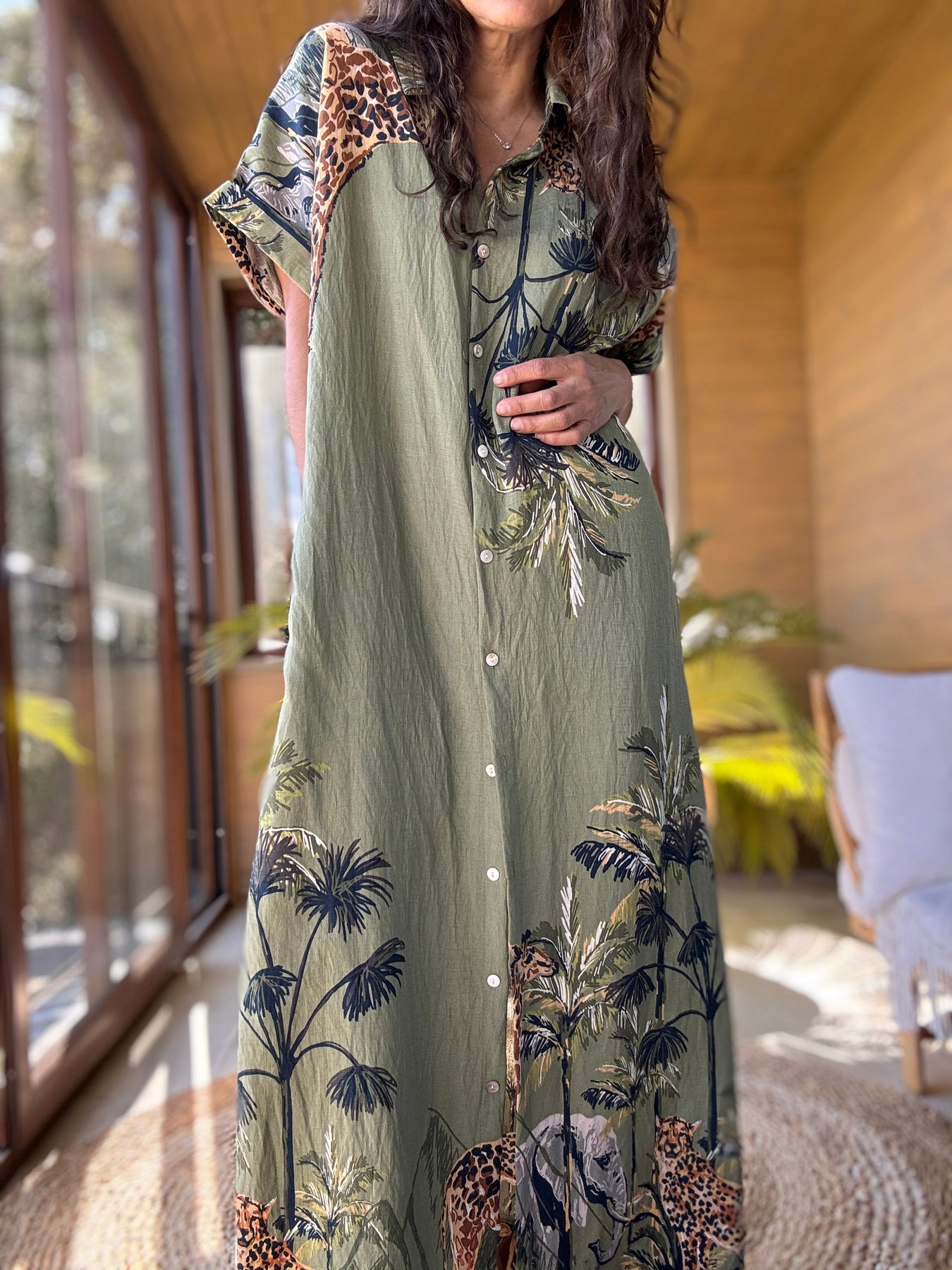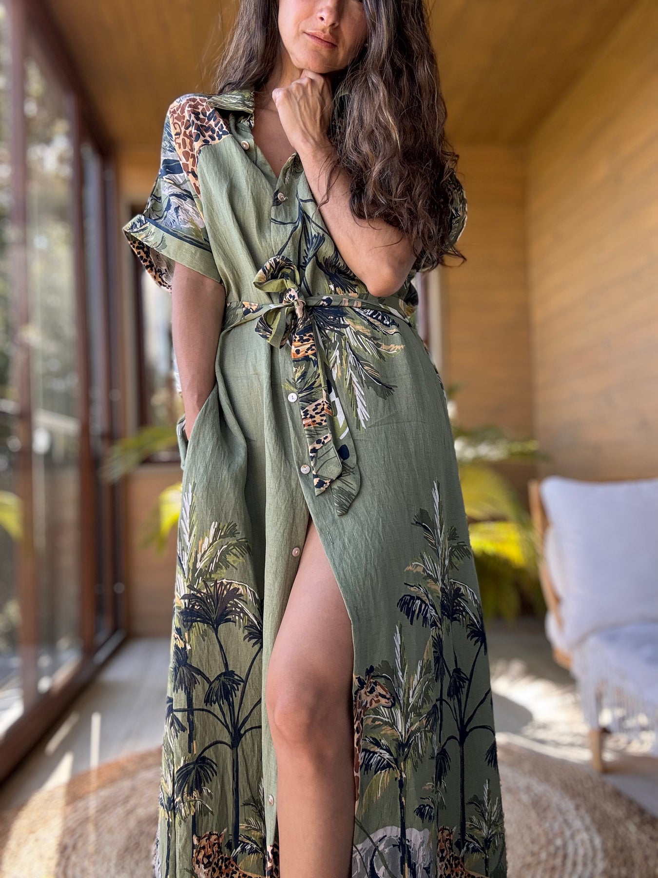Vestido linoto estampado selva con bolsillos laterales y cinto removible