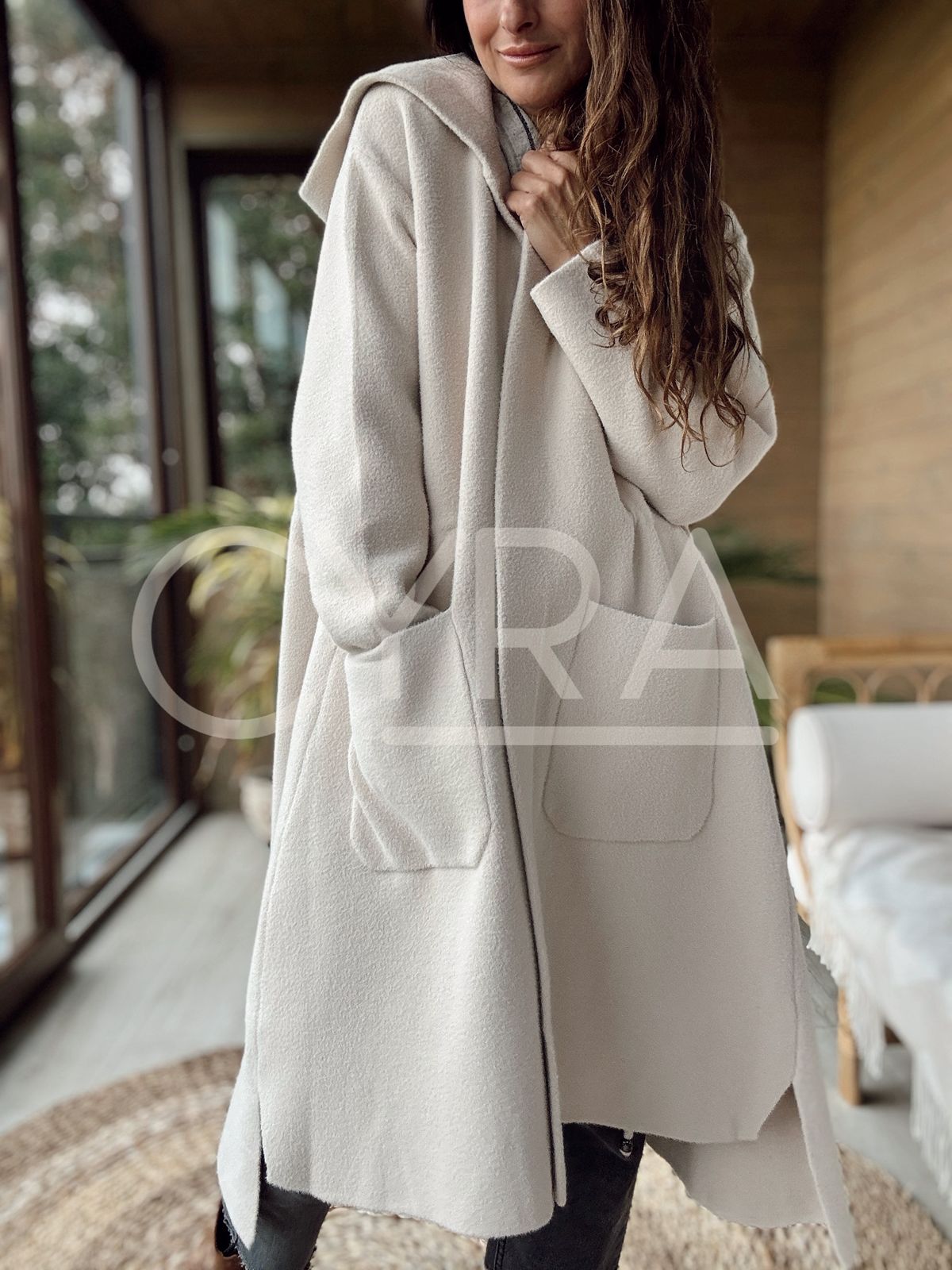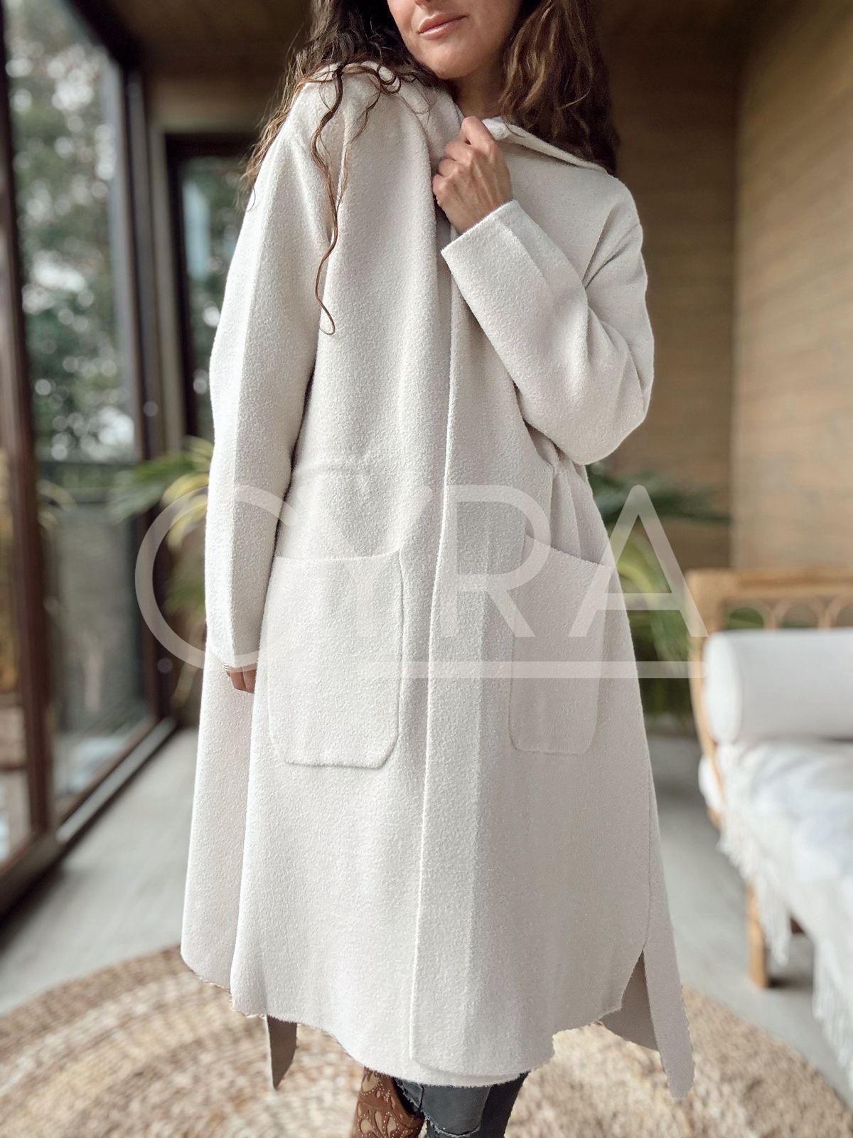 Abrigo paño elasticado color crudo con capucha, bolsillos laterales y botones tipo broche