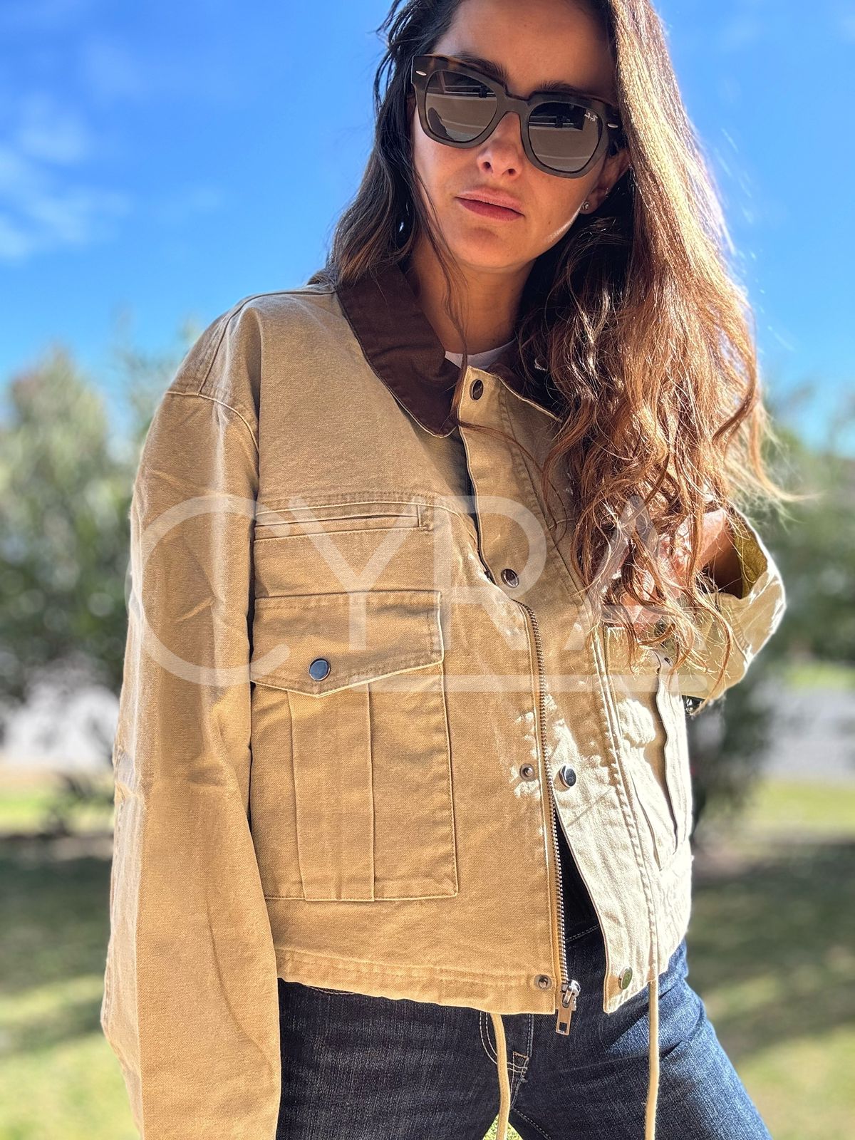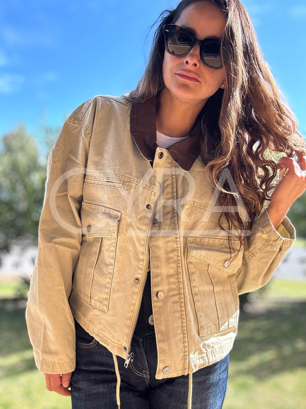 Chaqueta gabardina beige cuello cafe cierre metalico y botones tipo broche
