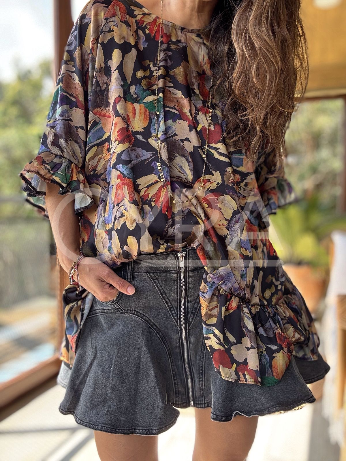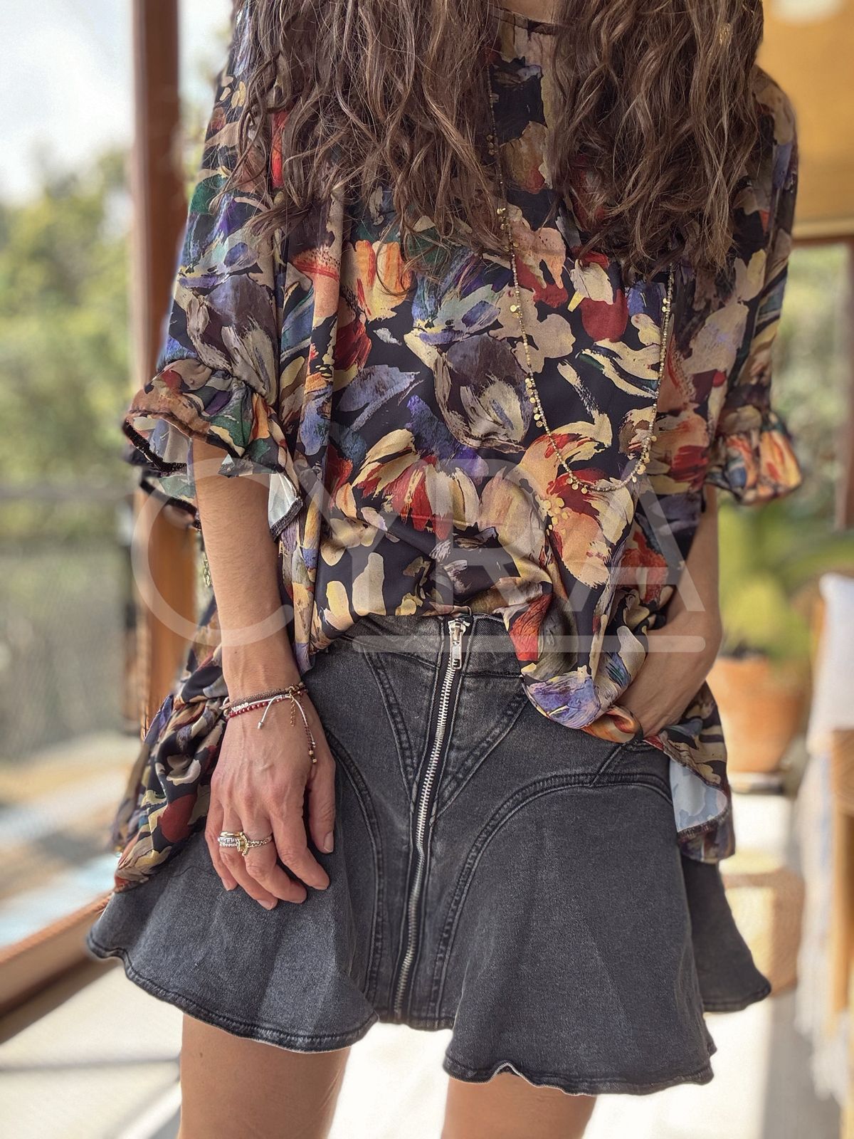 Mini falda de jeans elasticado color negro con cierre frontal y bolsillos