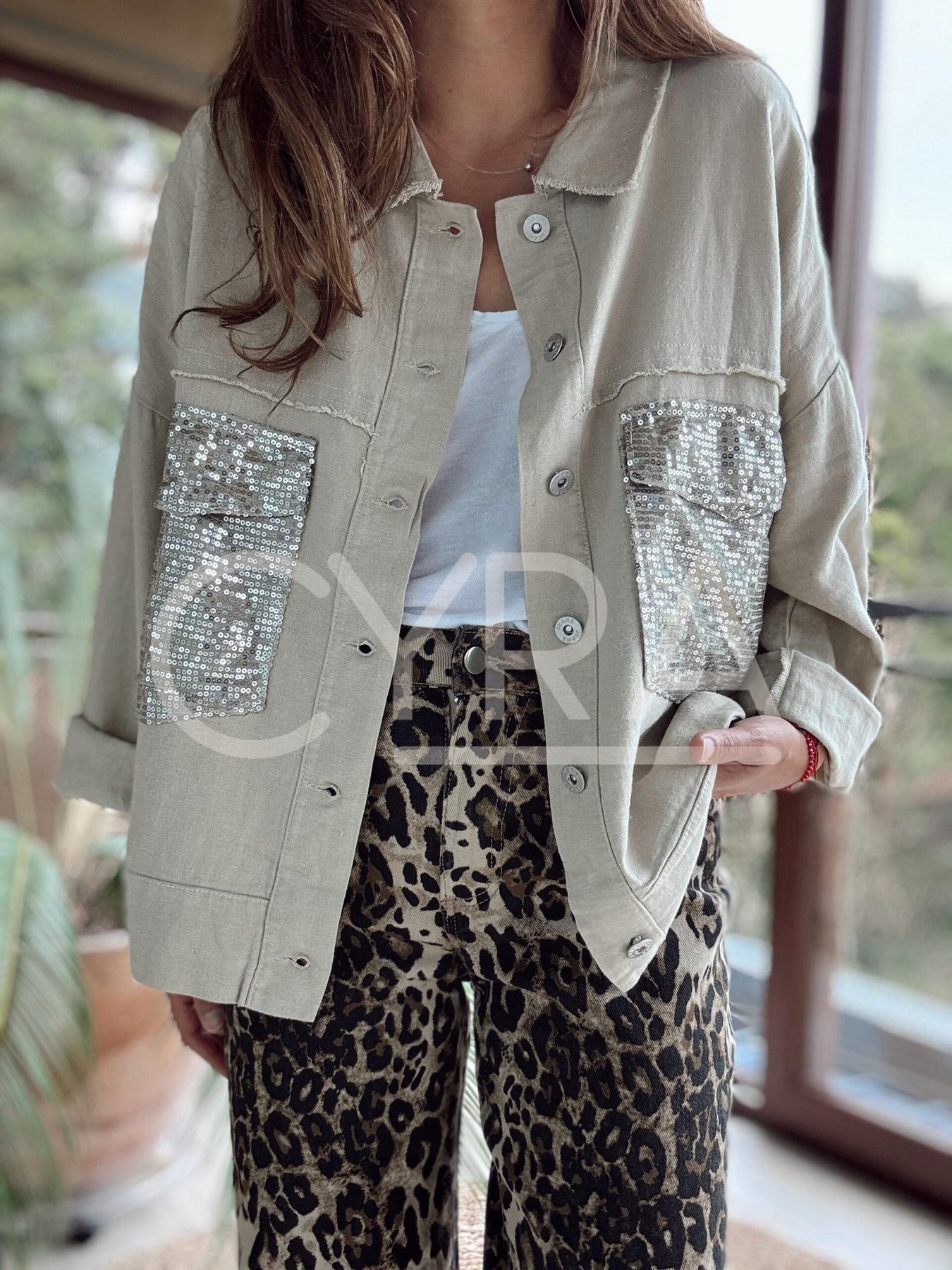 Chaqueta Lino aplicación de bolsillos con lentejuelas